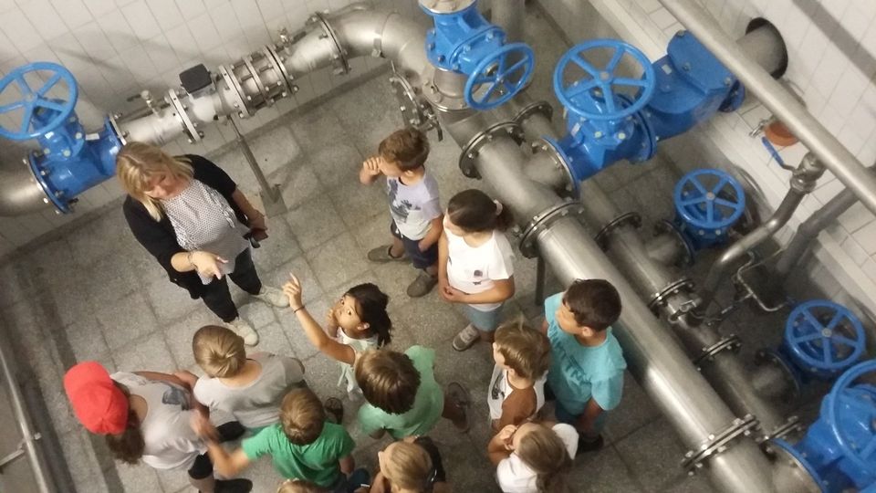 Anschließend besichtigten wir den Hochbehälter der Wasserversorgung Kutzenhausen und durften in den Keller zu den großen Wasserrohren hinabsteigen.